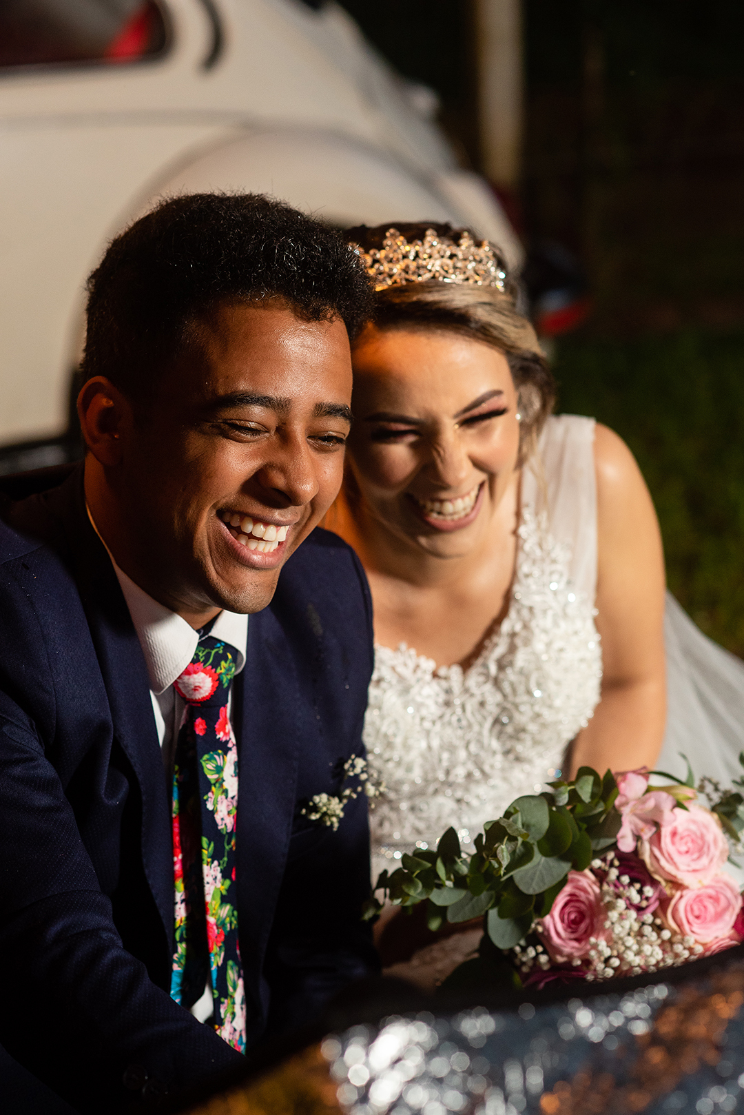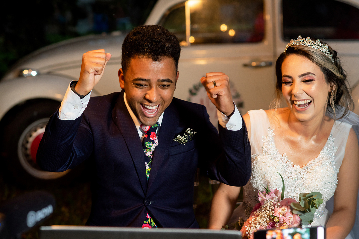 Conversei com os noivos: o casamento seria mantido e eles estavam decididos a casar como fosse possível, sendo felizes com sua decisão. Para se adaptar às novas regras, foi feito um modelo misto: somente cinco pessoas estariam presentes junto aos noivos (o que quase o tornou um elopement wedding). Além delas, três casais, cada um dentro de seu carro, observariam a cerimônia a partir do estacionamento (usando o modelo de casamento drive-in) e pelos seus celulares, assistindo à transmissão ao vivo. Via Zoom, do outro lado de uma tela, todos os outros convidados e até o celebrante, que conduziria a cerimônia pelo notebook.